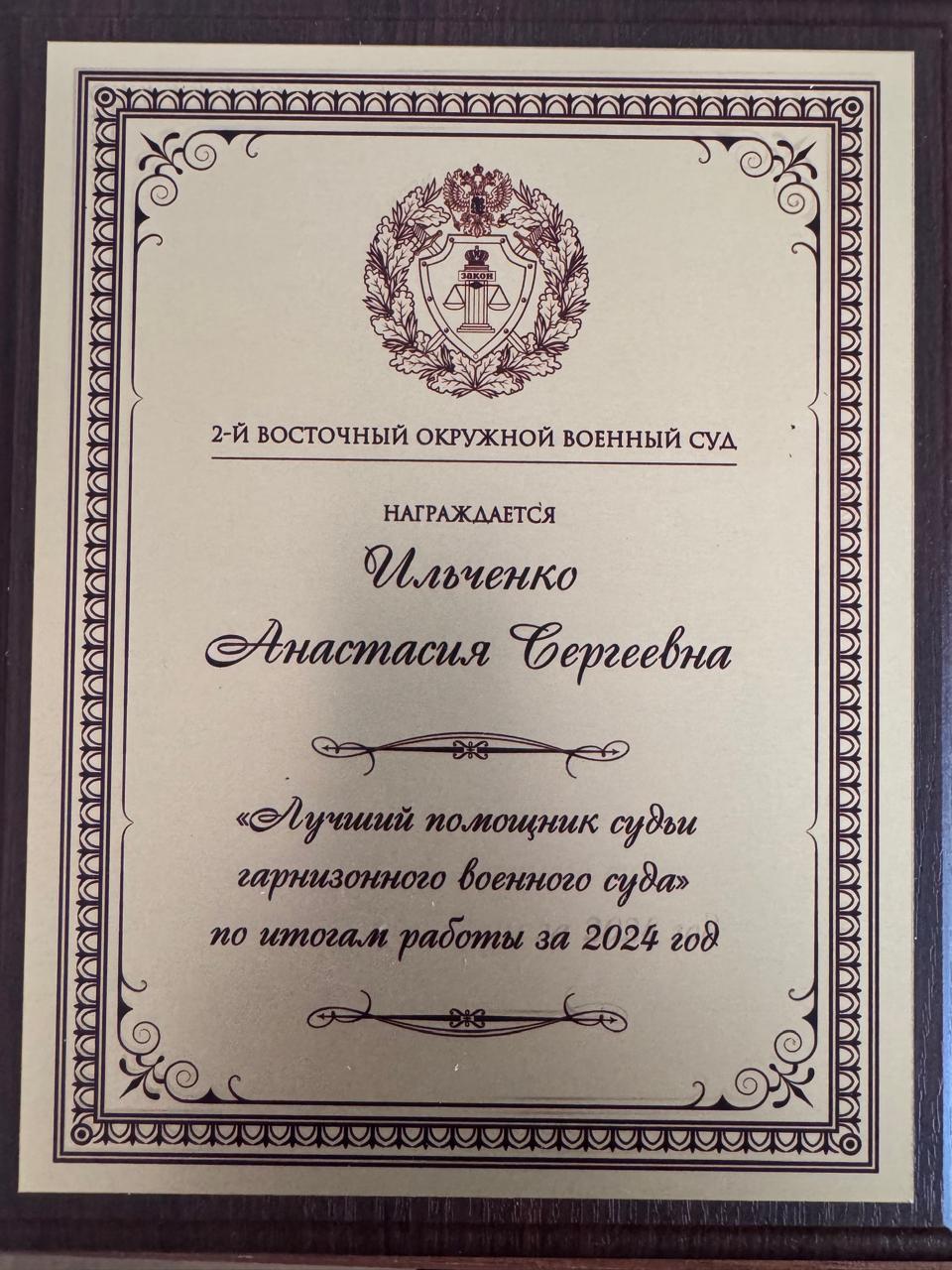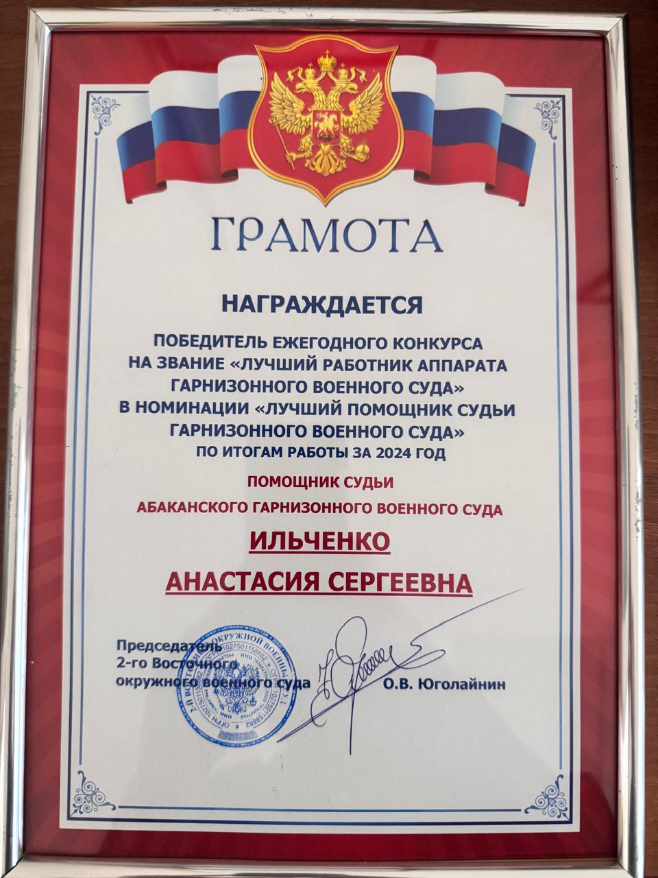 По итогам ежегодного конкурса профессионального мастерства на звание «Лучший работник аппарата гарнизонного военного суда», объявленного 2-ым Восточным окружным военным судом, помощник судьи Абаканского гарнизонного военного суда Анастасия Ильченко признана победителем в номинации «Лучший помощник судьи гарнизонного военного суда» по итогам работы за 2024 год. ![]() |