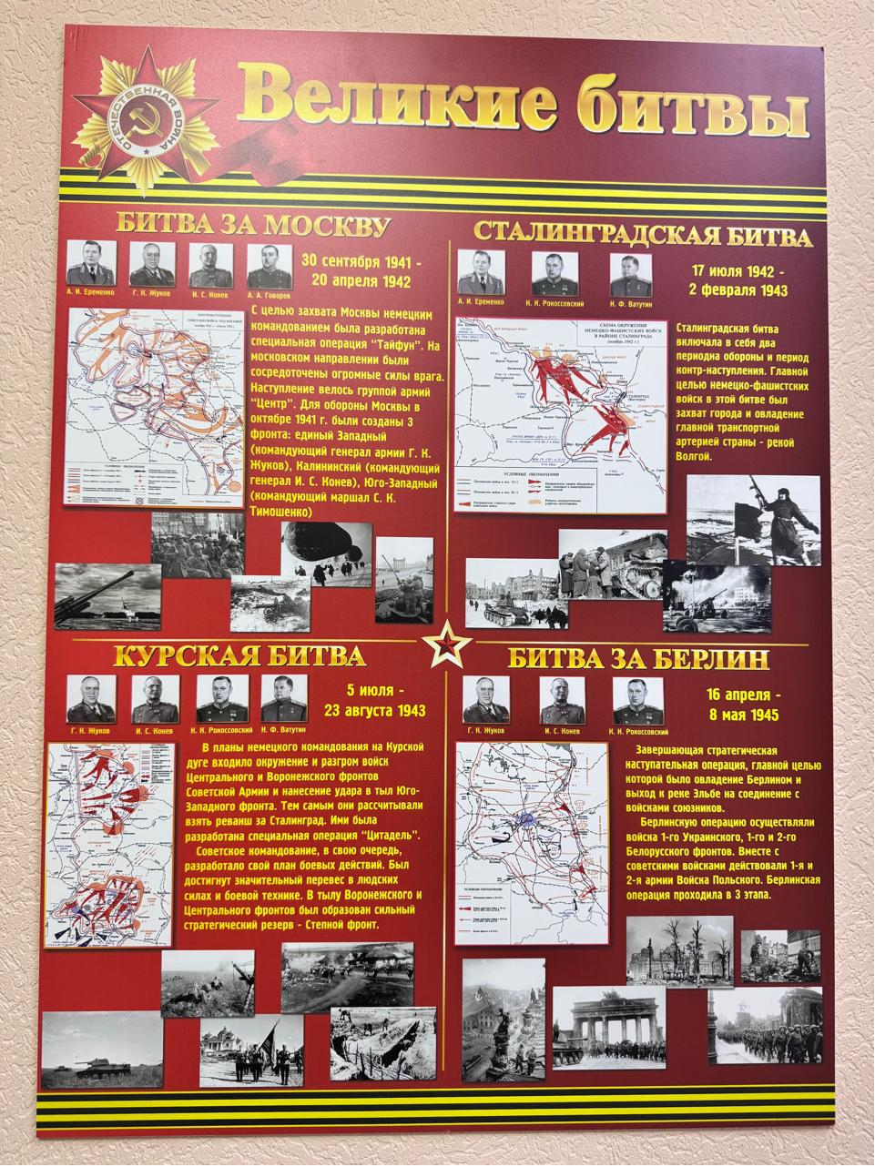 В преддверии празднования 80-летия Победы в Великой Отечественной войне Абаканский гарнизонный военный суд разместил на фасаде здания суда Знамя Победы, как символ победы советского народа над нацистскими захватчиками. Так же в фойе здания военного суда размещен стенд, посвященный великим битвам Великой войны в память о подвиге наших предков. Мы обязаны сберечь связь поколений, сохранить историческую память о событиях прошлого и передать ее от предков и дедов – внукам и правнукам. ![]() |