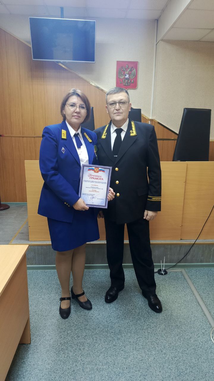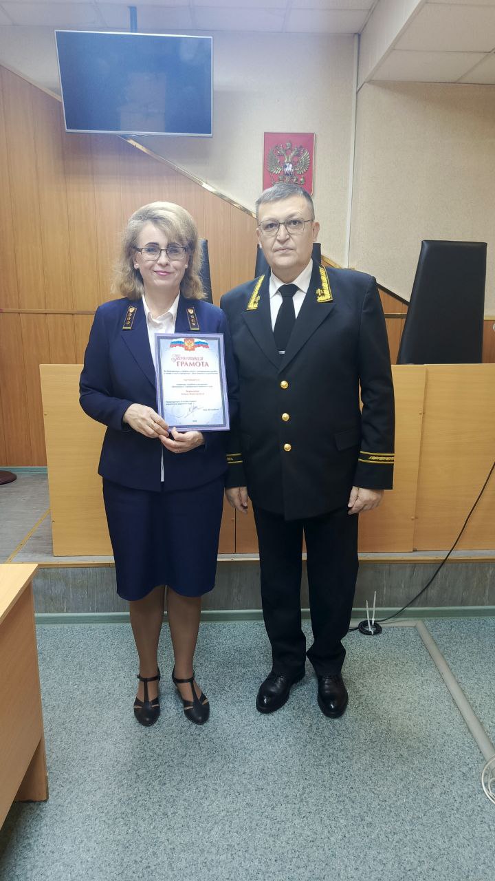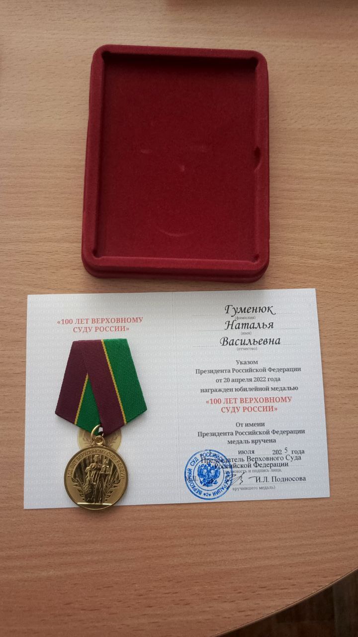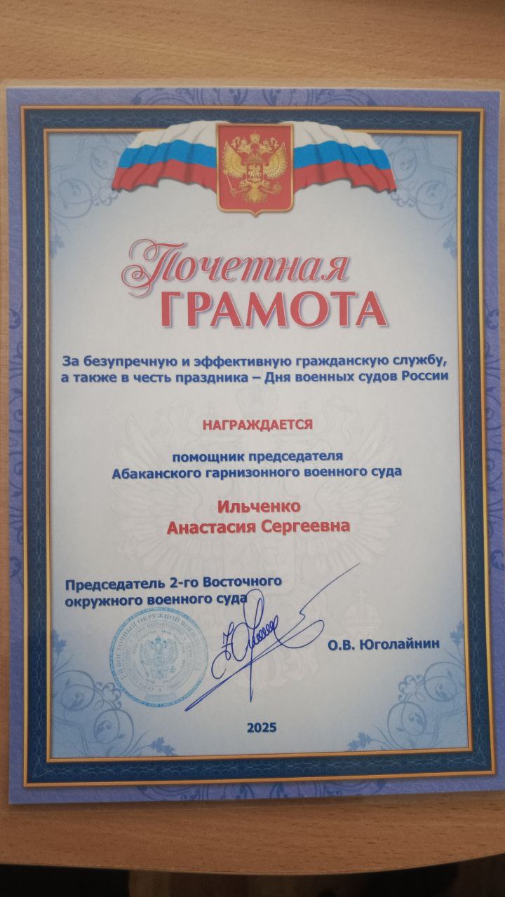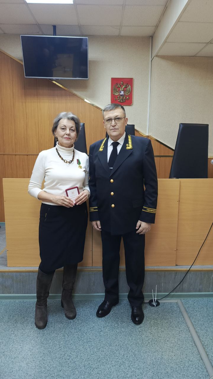 | Награждения сотрудников аппарата суда В торжественной обстановке в честь праздника – Дня военных судов России председатель Абаканского гарнизонного военного суда Миронов Константин Владимирович поздравил весь коллектив с праздником и вручил заслуженные награды работникам аппарата суда. За безупречную и эффективную службу Почетными грамотами председателя 2-го Восточного окружного военного суда Юголайнина О.В. награждены начальник отдела Чочиева А.Ю., помощник председателя Ильченко А.С., и секретарь судебного заседания Воронкова Е.Н. За многолетний плодотворный труд и особые заслуги в профессиональной деятельности Указом Президента Российской Федерации награждены юбилейными медалями «100 лет Верховному Суду России» находящиеся на заслуженной пенсии начальник отдела Богатырева А.И. и ведущий специалист Гуменюк Н.В. ![]() ![]() |